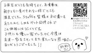 子供にも優しい宿でしたので、今度は友達一家をさそってまた来たいなと思いました。【ワンちゃん、ご夫婦旅】